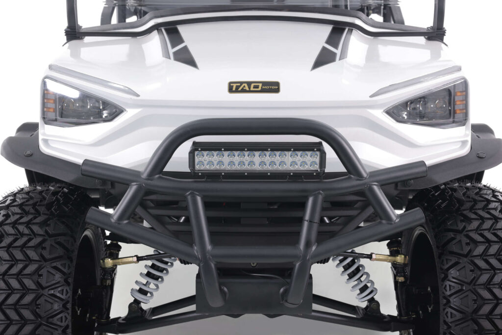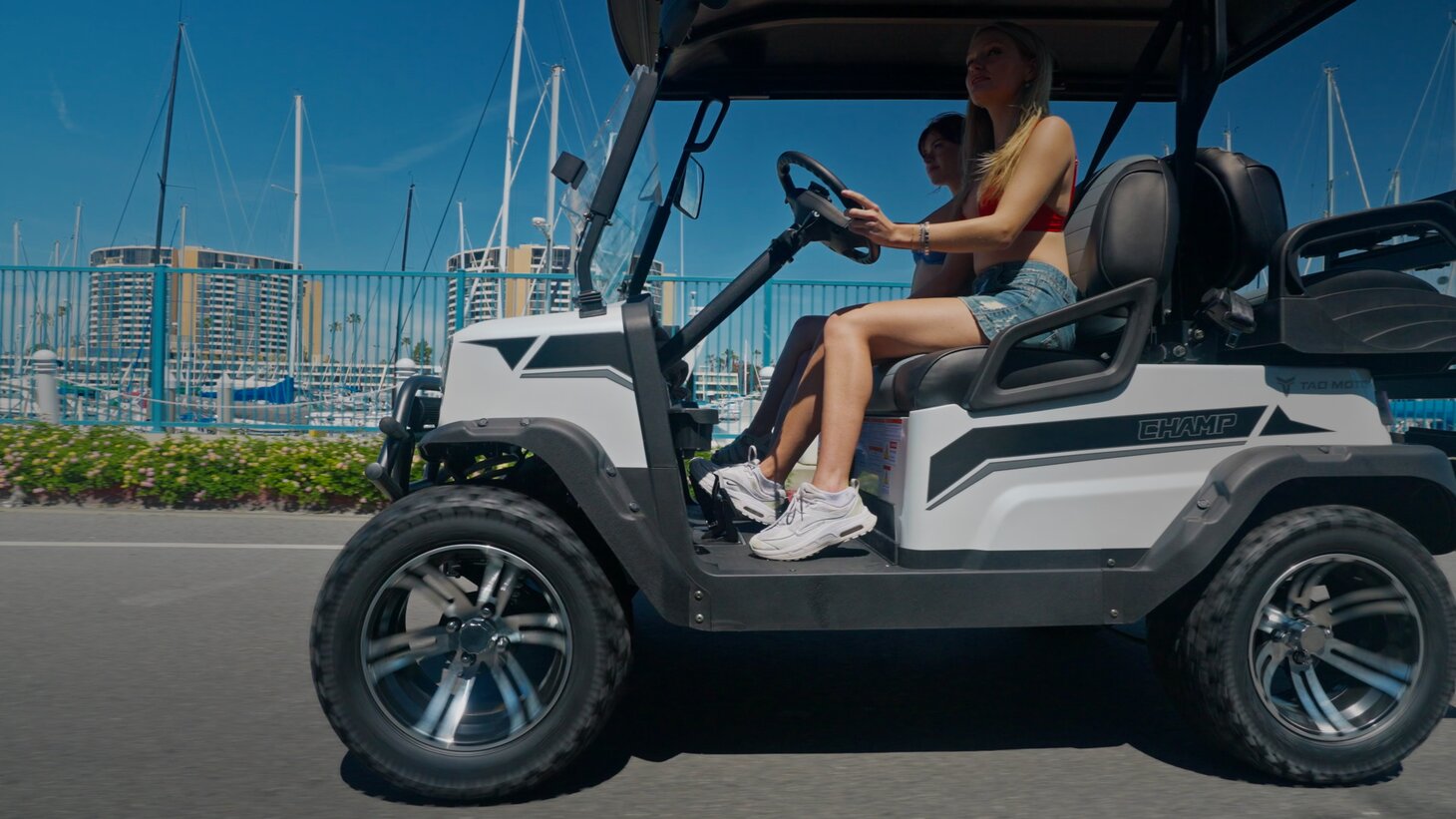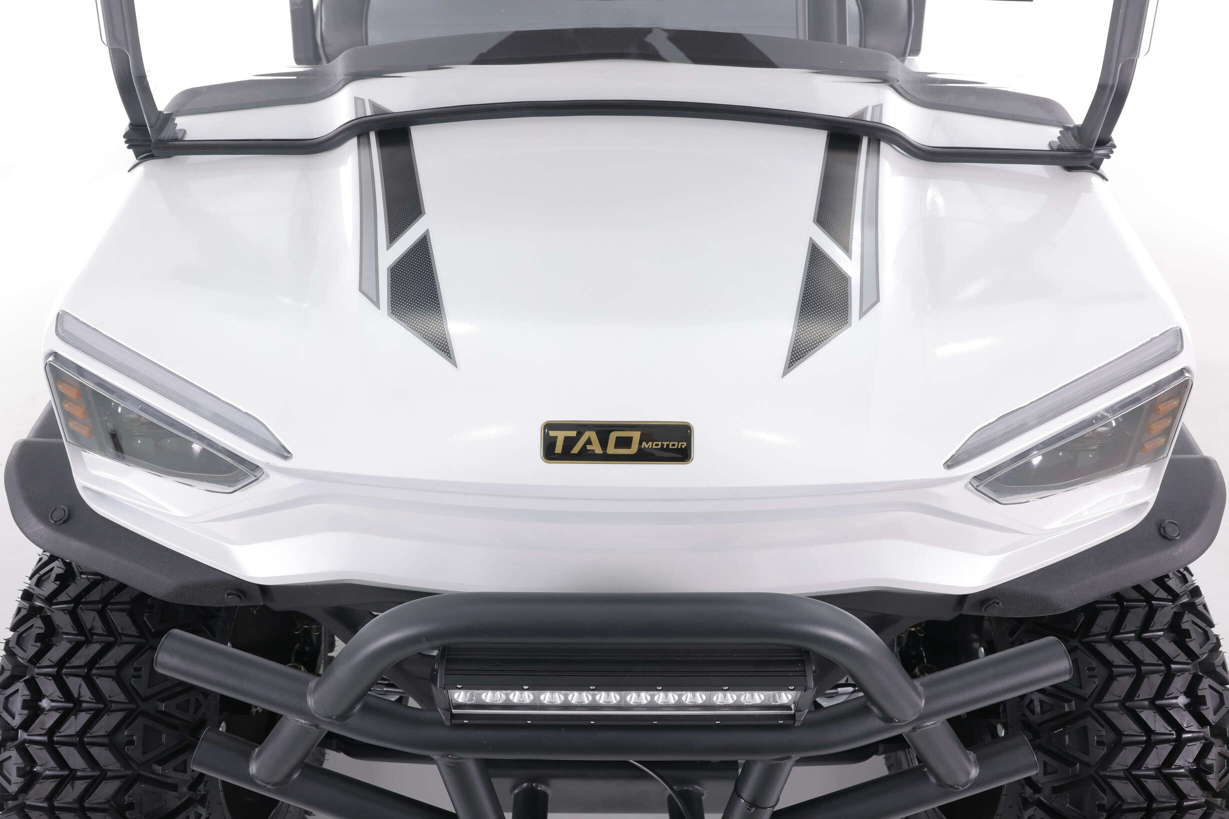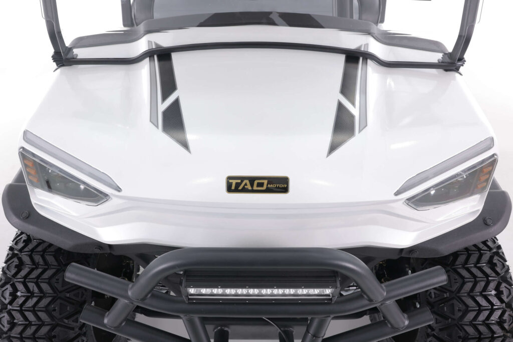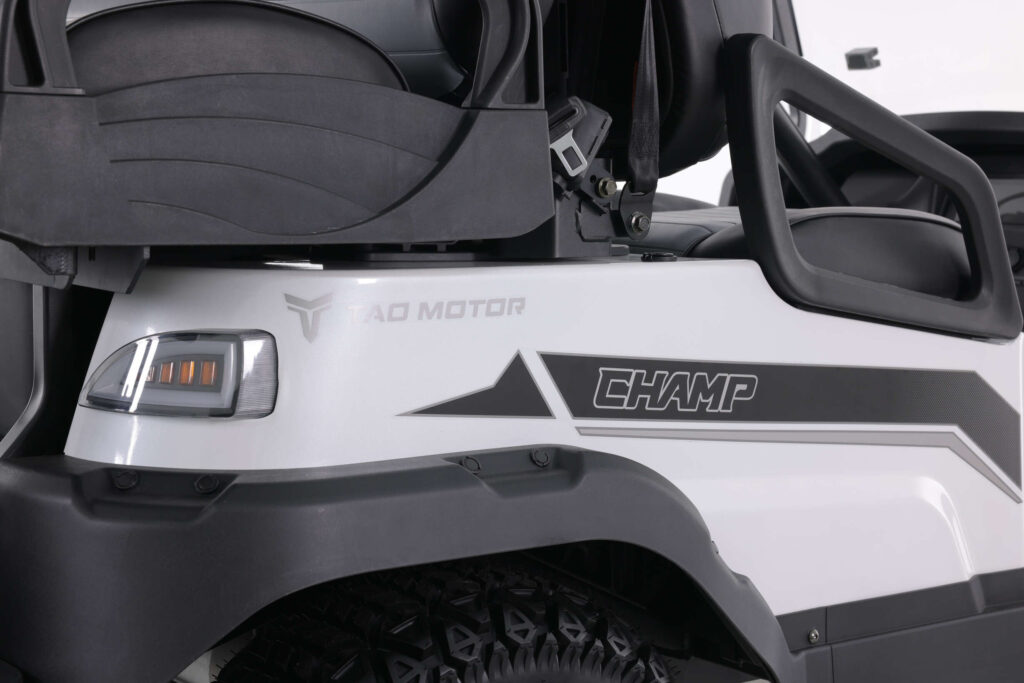 You asked. We listened. Tao Motor now offers a completely new riding experience for enjoying the great outdoors. Introducing the Champ Golf Cart! All new for 2023, the Champ is the first of its kind for the Tao Motor brand. Whether it is family night or date night, the Champ allows for easy riding with plenty of features and storage to accommodate everyone. From the front to the back, no detail was overlooked. No matter the weather, the Champ can be enjoyed rain or shine. With a full-length roof and foldable windshield, you can take cover from the rain or enjoy the summer breeze. Exceeding in comfort and safety, the Champ provides each passenger with premium seating, safety belts, and grab bars. Only two of you along for the ride? The rear-facing seats easily transform into a convenient flip deck so you never have to leave anything behind. Not only for storage, the compartment under the rear seats can also be utilized as a cooler, complete with a drain plug for easy cleanup. Fully electric with a 48V 5KW motor, the Champ boasts plenty of power to keep the fun going for hours, even after the sun goes down. LED Turn signals, headlights, and tail lights allow for plenty of visibility, and the colorful display screen lets you know when it’s time to call it a day. Innovative of its kind, the Champ comes stocked with rear drum brakes, so you’ve got plenty of stopping power exactly when you need it. Available in gray or white with sleek decals, the Champ is ready to take you on a brand-new adventure.