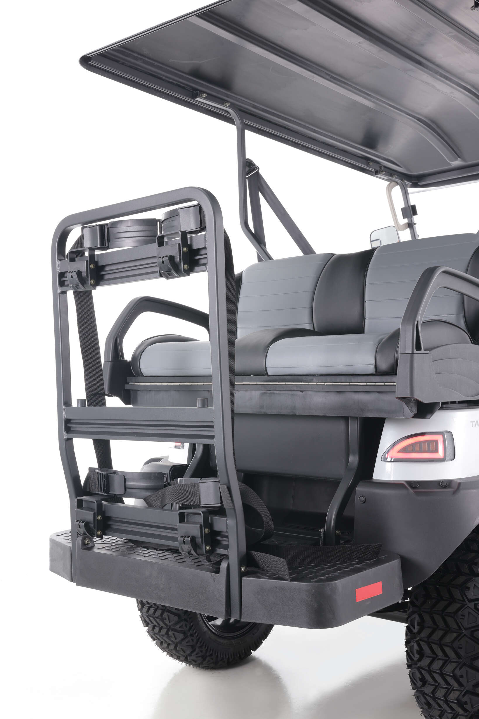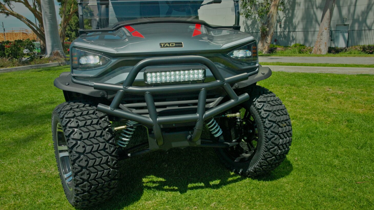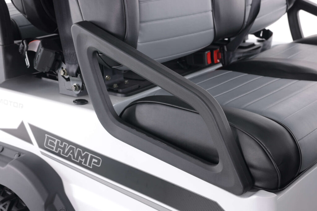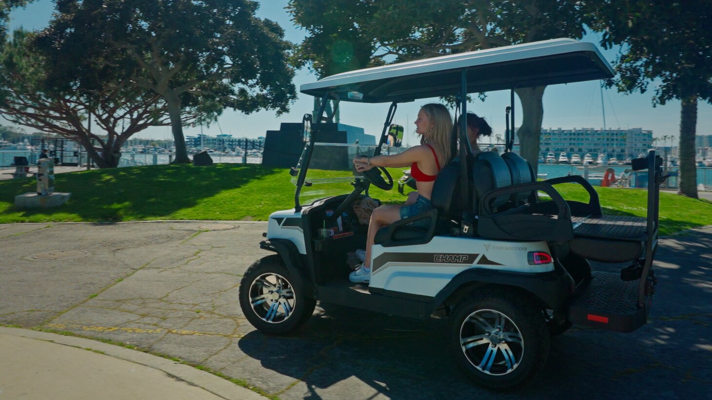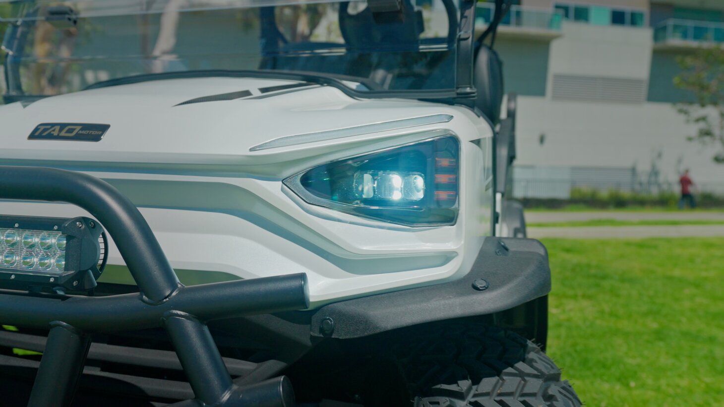 You asked. We listened. Tao Motor now offers a completely new riding experience for enjoying the great outdoors. Introducing the Champ Golf Cart! All new for 2023, the Champ is the first of its kind for the Tao Motor brand. Whether it is family night or date night, the Champ allows for easy riding with plenty of features and storage to accommodate everyone. From the front to the back, no detail was overlooked. No matter the weather, the Champ can be enjoyed rain or shine. With a full-length roof and foldable windshield, you can take cover from the rain or enjoy the summer breeze. Exceeding in comfort and safety, the Champ provides each passenger with premium seating, safety belts, and grab bars. Only two of you along for the ride? The rear-facing seats easily transform into a convenient flip deck so you never have to leave anything behind. Not only for storage, the compartment under the rear seats can also be utilized as a cooler, complete with a drain plug for easy cleanup. Fully electric with a 48V 5KW motor, the Champ boasts plenty of power to keep the fun going for hours, even after the sun goes down. LED Turn signals, headlights, and tail lights allow for plenty of visibility, and the colorful display screen lets you know when it’s time to call it a day. Innovative of its kind, the Champ comes stocked with rear drum brakes, so you’ve got plenty of stopping power exactly when you need it. Available in gray or white with sleek decals, the Champ is ready to take you on a brand-new adventure.